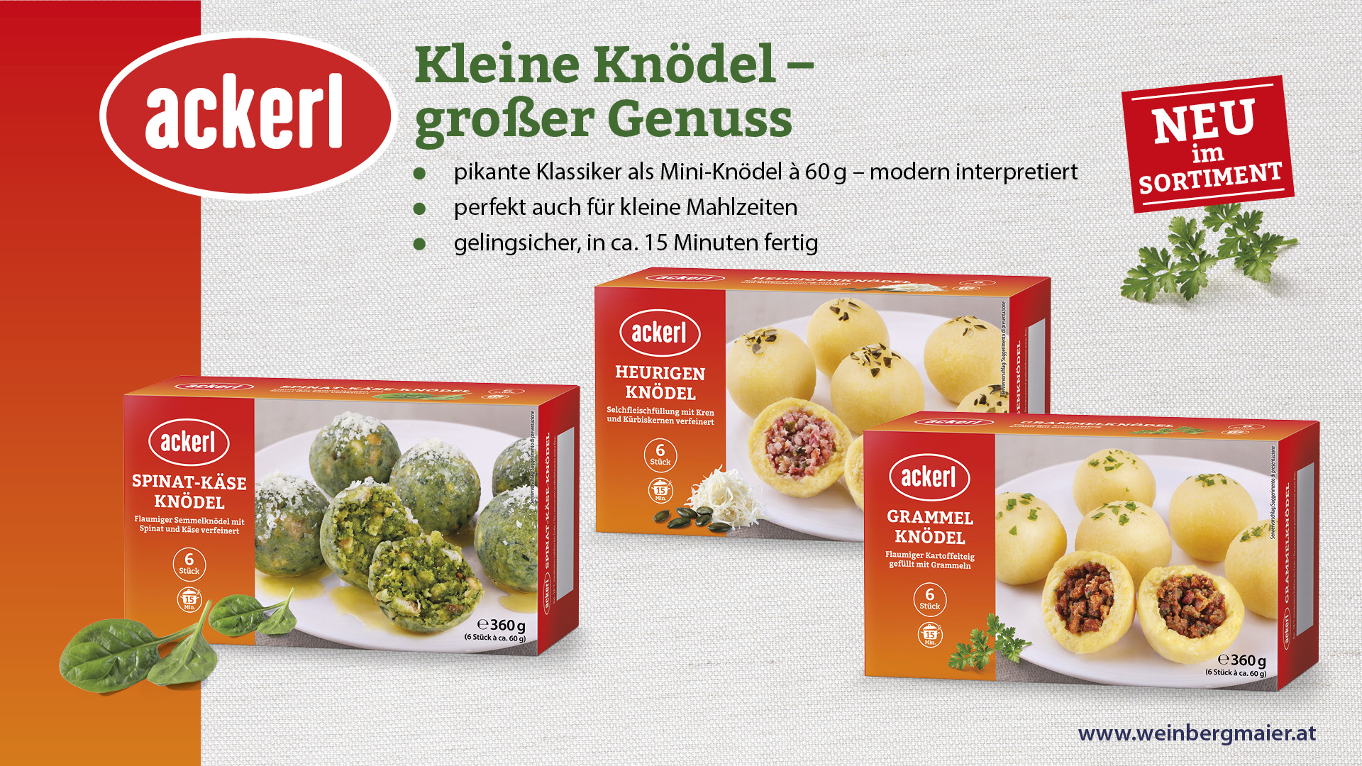 Die Knödelmarke Ackerl, die seit 2021 das Weinbergmaier-Sortiment bereichert, überzeugt mit traditionellen Gerichten ebenso wie mit modernen Interpretationen. Die Produktpalette deckt viele Geschmäcker ab – von deftig bis vegetarisch. Mit dem neuen Mini-Knödel-Sortiment will Weinbergmaier, dank kleinerer Portionsgrößen, der Lebensmittelverschwendung entgegenwirken und gleichzeitig für Arbeitserleichterung sorgen. Denn die tiefgekühlten Produkte sind gelingsicher und einfach und schnell zubereitbar. Die Packungsgröße mit 2-3 Portionen ist ideal für kleinere Haushalte und eignet sich perfekt als Mahlzeit für Singles, Paare und Jungfamilien – ganz nach dem Trend: Zuhause Selberkochen, aber mit Komfort. Die Packung mit 360g findet in jedem Tiefkühlfach ihren Platz. Mit kreativen Rezepttipps von klassischen bis hin zu modernen Beilagen nutzt Ackerl nun neu auch die Verpackung für zusätzliche Inspirationen.